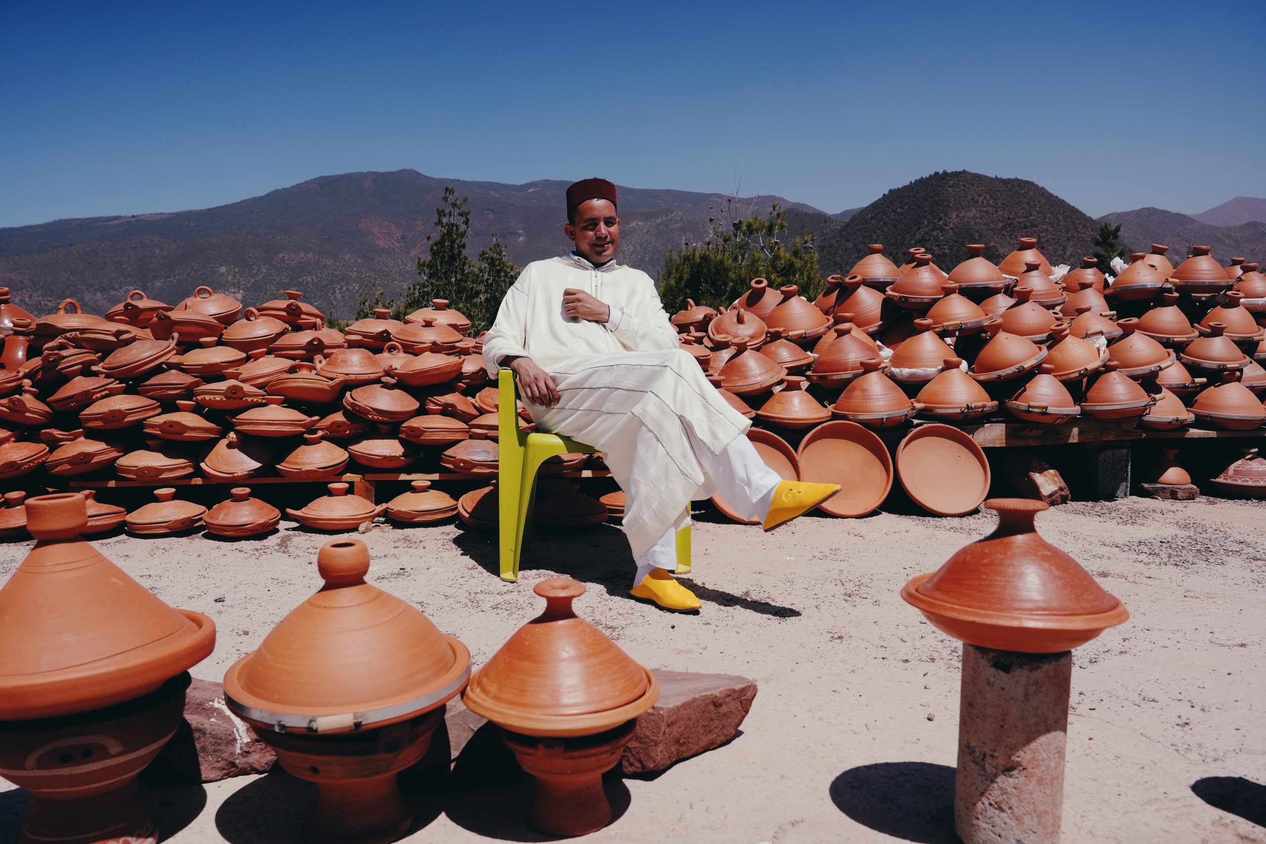 We then made our way to Marrekachi Life a Marrakech-based Atelier and brand that works exclusively with fabrics handwoven by their in-house team of artisans. Everything is made to order allowing them the ability to focus on zero waste and sustainable practices. Matching the intention, awareness, and traditional craftsmanship that reigns supreme at Beni Rugs, The Marrakchi Atelier factory, works carefully to align with those same values and principles. We met up with one of the owners Nicholas Minucciani, who took us for a tour and behind the scenes of the studio where each garment is made to order. Witnessing the meticulous artistry that breathed life into each bespoke creation was nothing short of awe-inspiring as it offered solace to ancient customs teetering on the edge of obscurity.
